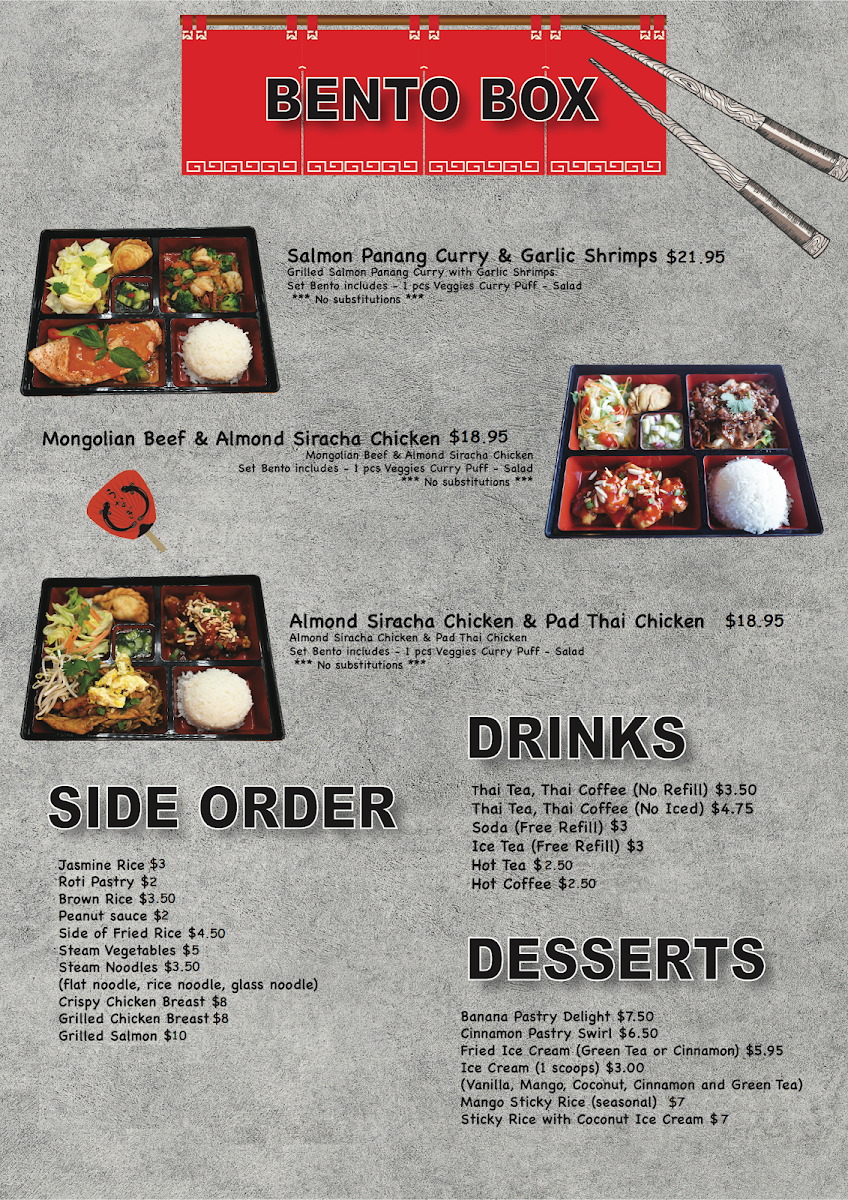 If you're in the mood for something spicy, the Spicy Tung Tac brings together a harmonious blend of Asian vegetables and peanuts, giving you the perfect kick wrapped in rice noodles. For a delightful bentobox experience, their sets, such as the Almond Sriracha Chicken & Pad Thai Chicken, offer a well-rounded meal with a veggie curry puff and salad.